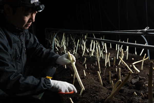 種子から育てたアスパラの苗を畑でふた夏(1年半)養成し、雪が降る前に大きく成長した株を掘り出してビニールハウスに植え替えます。冬季のハウス内は、アスパラの生育に最適の温度を保つため3重のシートで守られ、暖房と地中の電熱線で慎重に加温。ホワイト・アスパラは、100%遮光のシートを使った暗いトンネル内で育てられます。