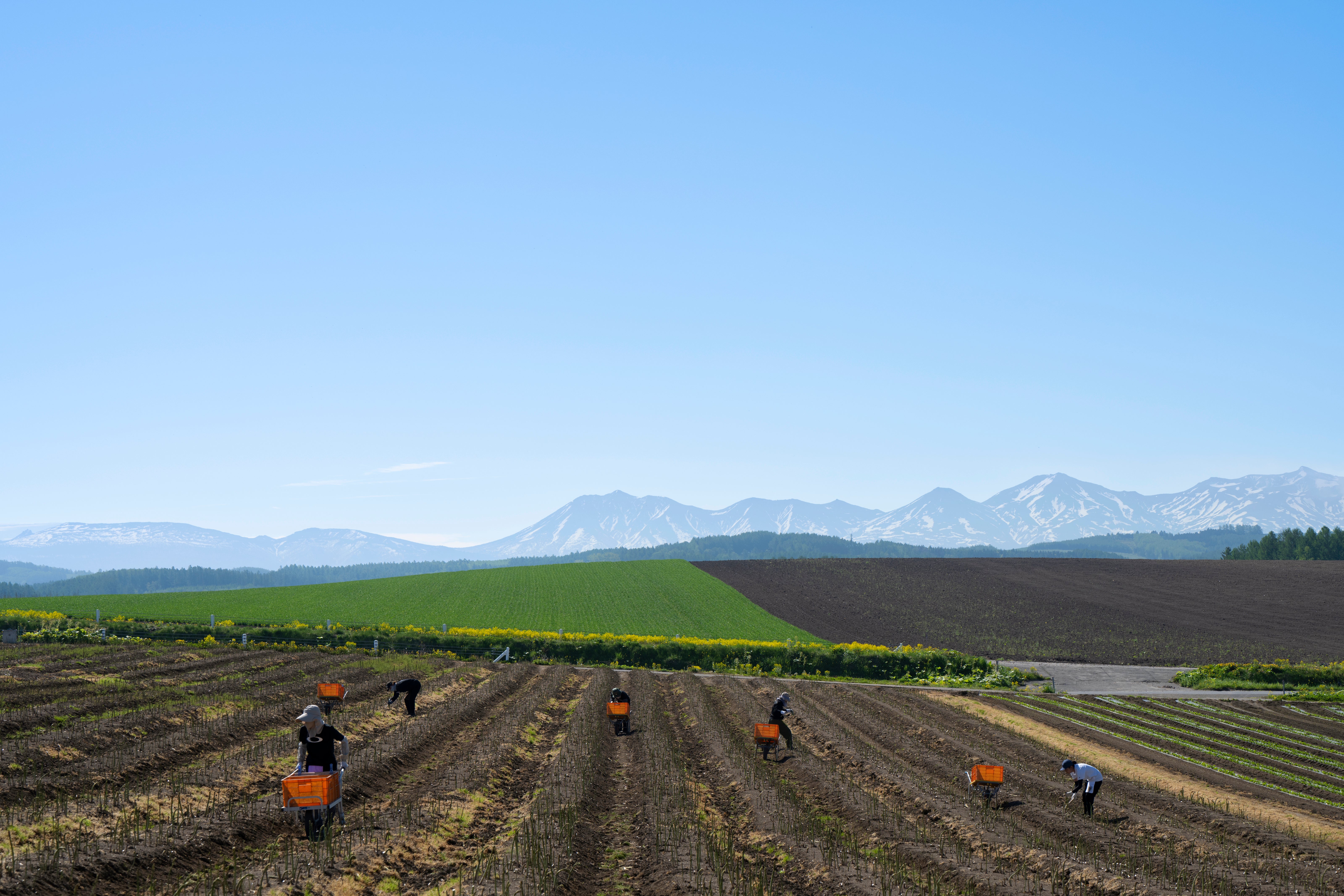 大雪山と十勝岳から湧き出す清らかで豊富な水、盆地ゆえに台風などによる天災が起こりにくい地理、冬の寒暖差を含め年間を通じて農業に適した気候。私たちはこうした特性をもつ地域だからこそ生み出せる、価値ある農産物を育てることにこだわり、作り手が健康的でのびやかに働ける環境作りも大切にしています。