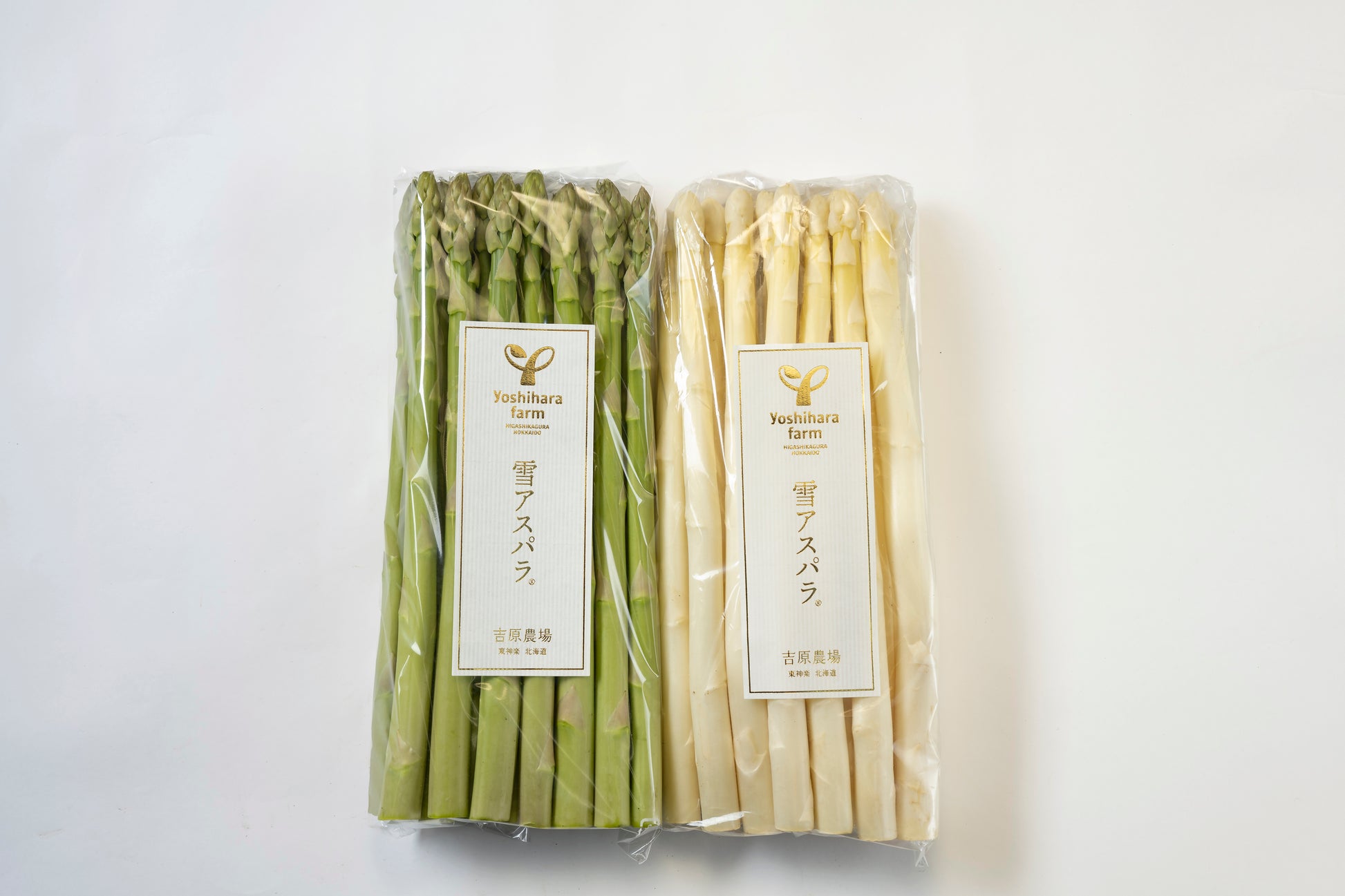 雪景色広がる真冬の北海道東神楽町で収穫される希少な雪アスパラのグリーンとホワイトのセット。春夏のものに比べくせが少なく、柔らかくみずみずしいのが特徴。※2kgまで同一送料で同梱可能